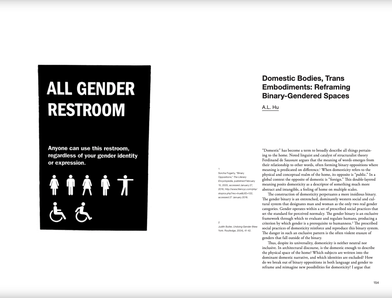 ...despite its universality, domesticity is neither neutral nor inclusive. In architectural discourse, is the domestic enough to describe the physical space of the home? Which subjects were written into the dominant domestic narrative, and which identities are excluded? How do we break out of binary oppositions in both language and gender to reframe and reimagine new possibilities for domesticity?